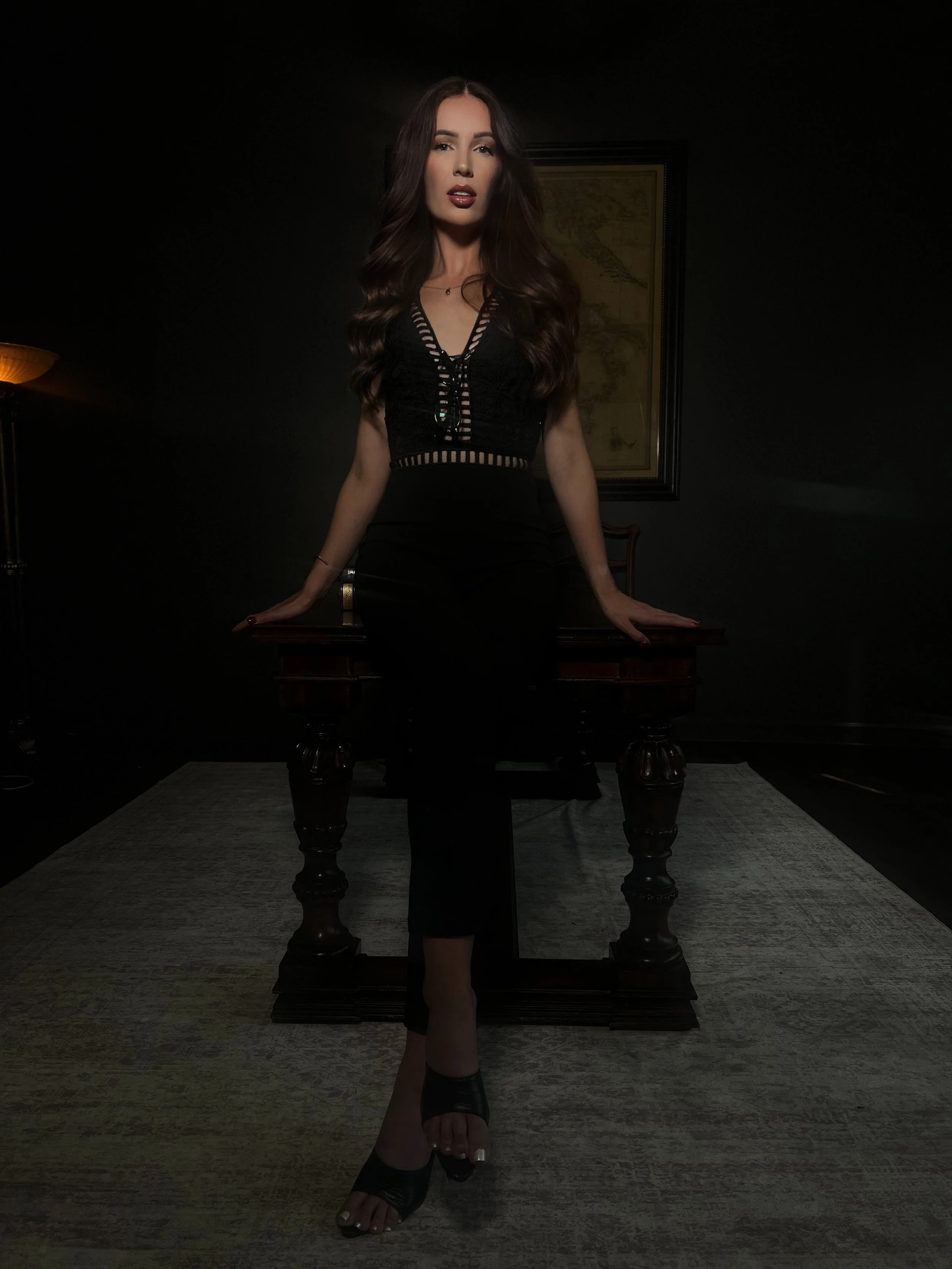 This is where excuses die. You feel the edge of the desk against your stomach, your hands pressed flat to the surface. Her voice is the only sound. When she tells you to count, you count. When she tells you to hold still, you do not move. The world outside might as well not exist. The only thing that matters is what she is about to do next.